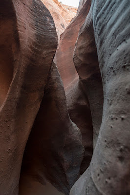 After descending the rock jam, the canyon narrows significantly. Adventurers will find themselves twisting and turning through much tighter spaces than those found in Peek-a-boo. You will have to travel sideways to get through many places, and it is also possible to get your feet jammed in some tight spots. If you are planning on doing this section of Spooky, be advised that it will be difficult to impossible if you are a very large person or if you have a large pack.